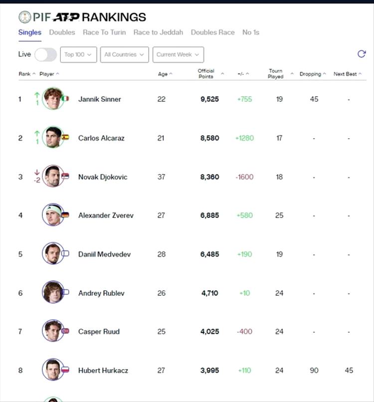 اقتنص الإيطالي يانينك سينر، صدارة التصنيف العالمي للاعبي التنس المحترفين الصادر، اليوم الاثنين، بعد وصوله لنصف نهائي بطولة "رولان غاروس"، والتي غادرها الصربي نوفاك ديوكوفيتتش، من ربع النهائي، ليتنازل عن الصدارة ويتراجع للترتيب الثالث، ليصبح بذلك سينر أول إيطالي يتصدر تصنيفات رابطة محترفي اللعبة.