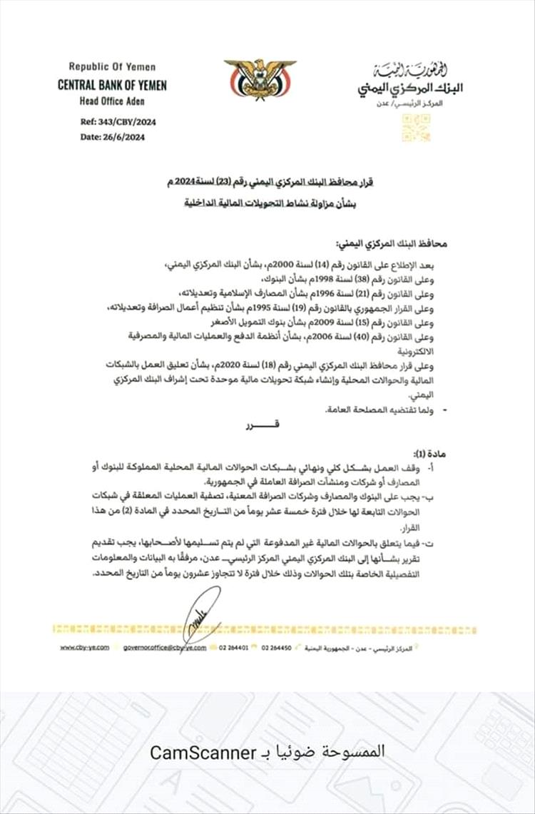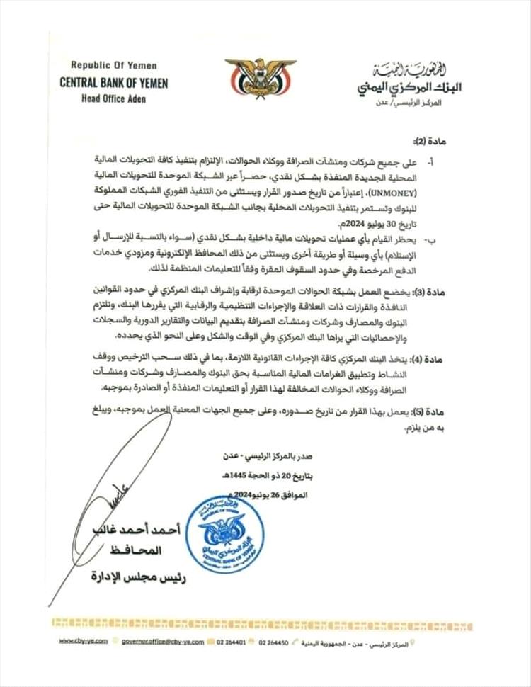 وقضت المادة الأولى من القرار الذي حمل رقم 23 لسنة 2024م، بوقف العمل بشكل كلي ونهائي بشبكات الحوالات المالية المحلية المملوكة للبنوك والمصارف أو شركات ومنشآت الصرافة العاملة في الجمهورية.