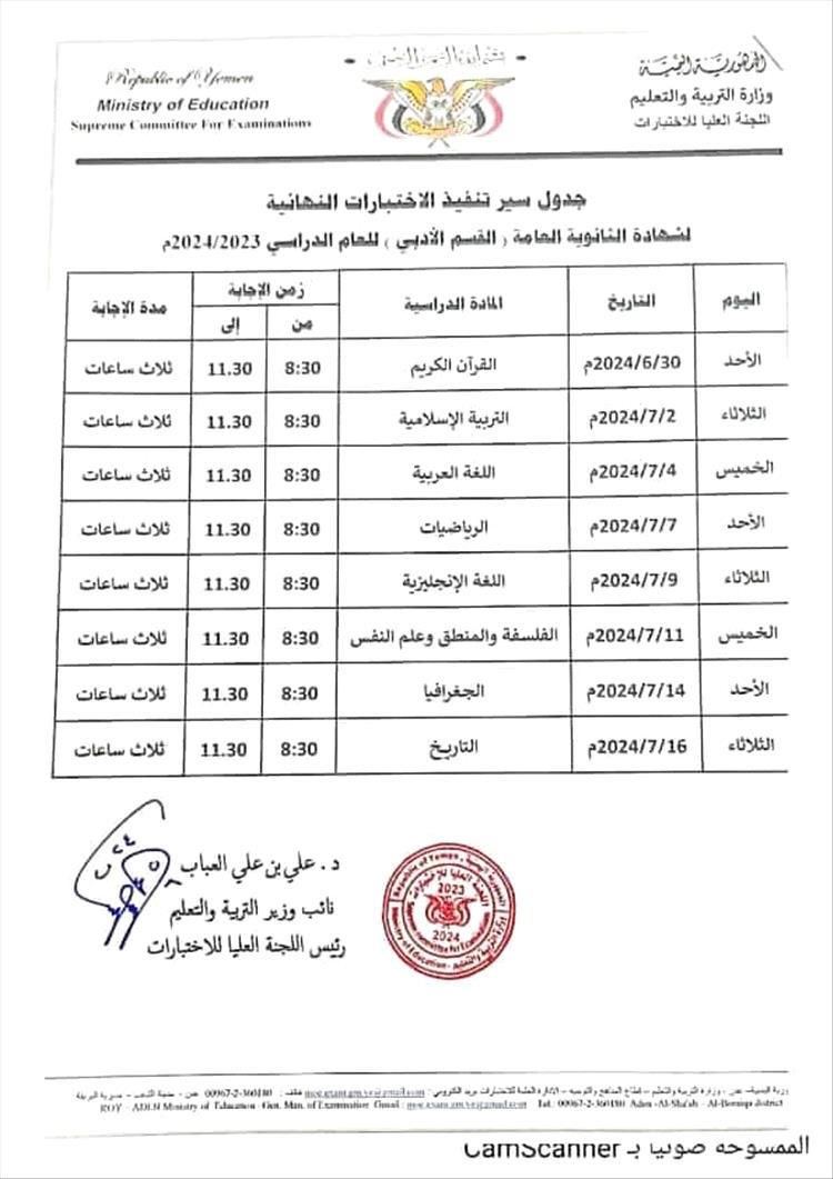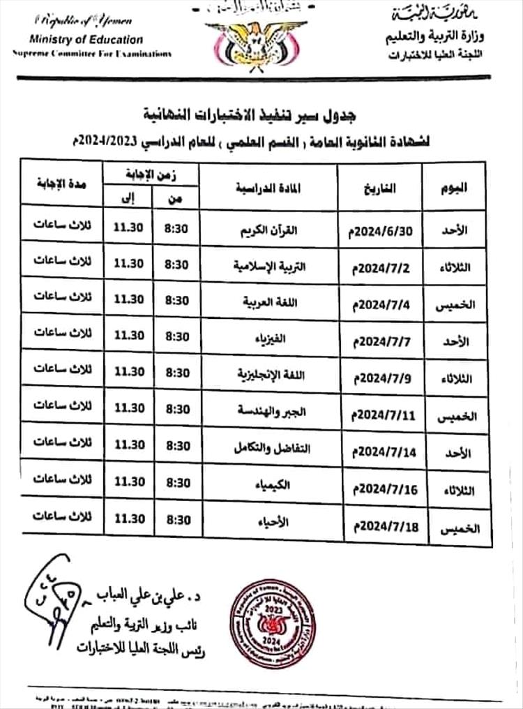 وحسب الإعلان الذي نشره الإعلام التربوي/ عدن، وحصل عدن تايم على نسخة منه، فإن الامتحانات في القسمين العلمي والأدبي تبدأ يوم الأحد 30 يونيو 2024م، بمادة القرآن الكريم.
