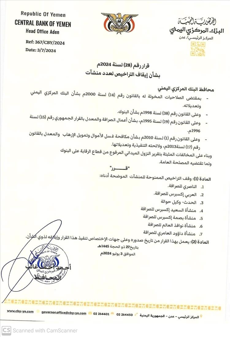 أصدر محافظ البنك المركزي اليمني أ. أحمد أحمد غالب اليوم الأربعاء الموافق 3 يوليو 2024م، قرار بإيقاف تراخيص لمنشآت الصرافة التالية: