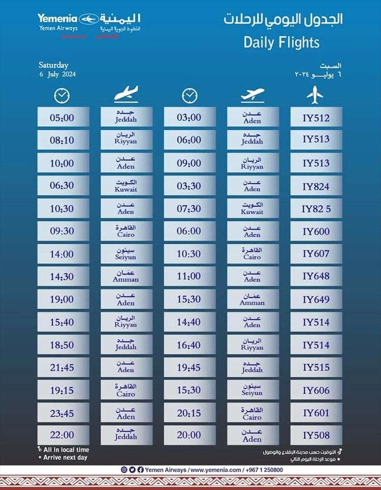 مواعيد اقلاع رحلات طيران اليمنية لليوم السبت كالتالي: