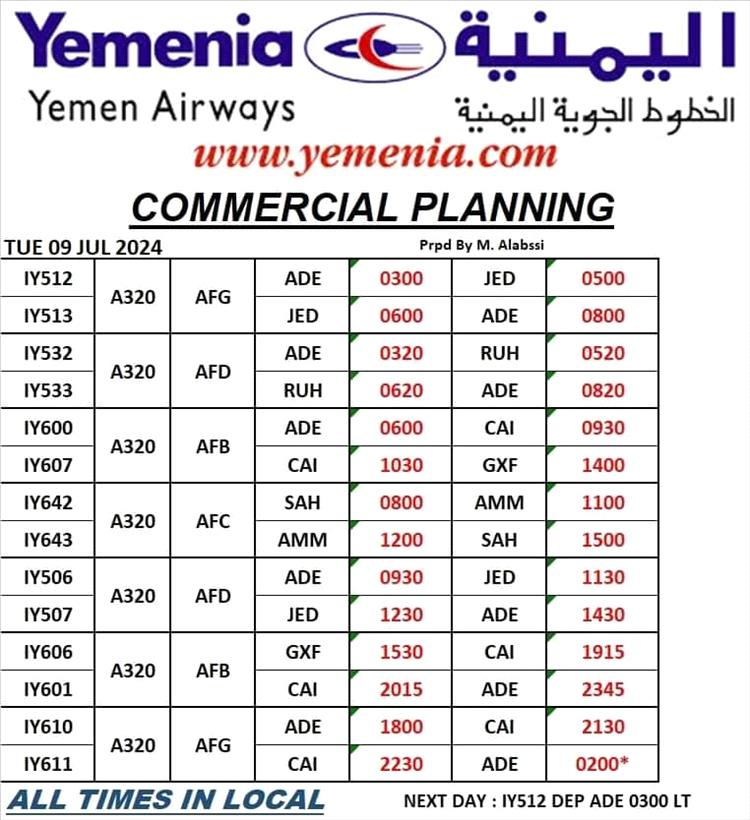 جدول مواعيد إقلاع رحلات طيران اليمنيه ليوم غد الثلاثاء