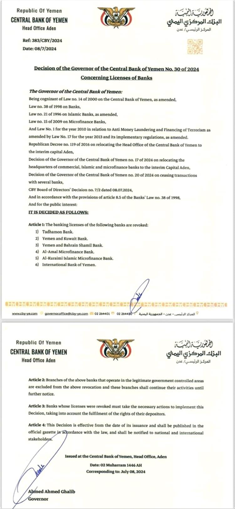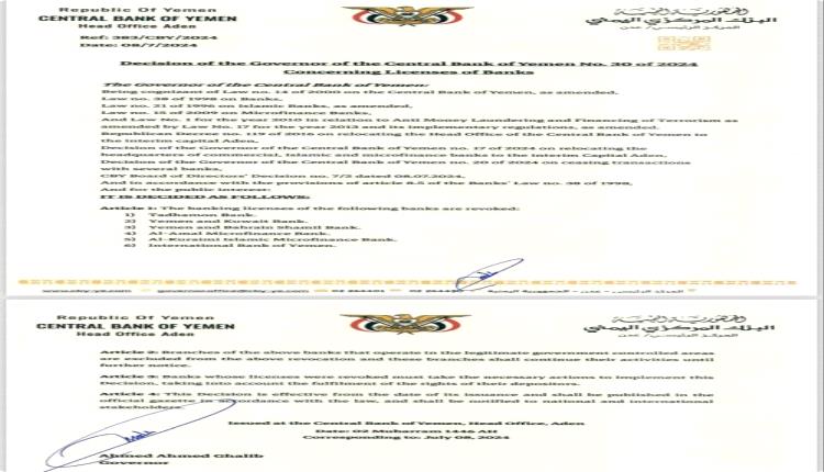 أصدر البنك المركزي اليمني، تعميم بإلغاء تراخيص مجموعة من البنوك المحلية التي تخلفت عن قرار نقل مراكزها الرئيسية الى العاصمة عدن، وسبق أن تم حظر التعامل معها.