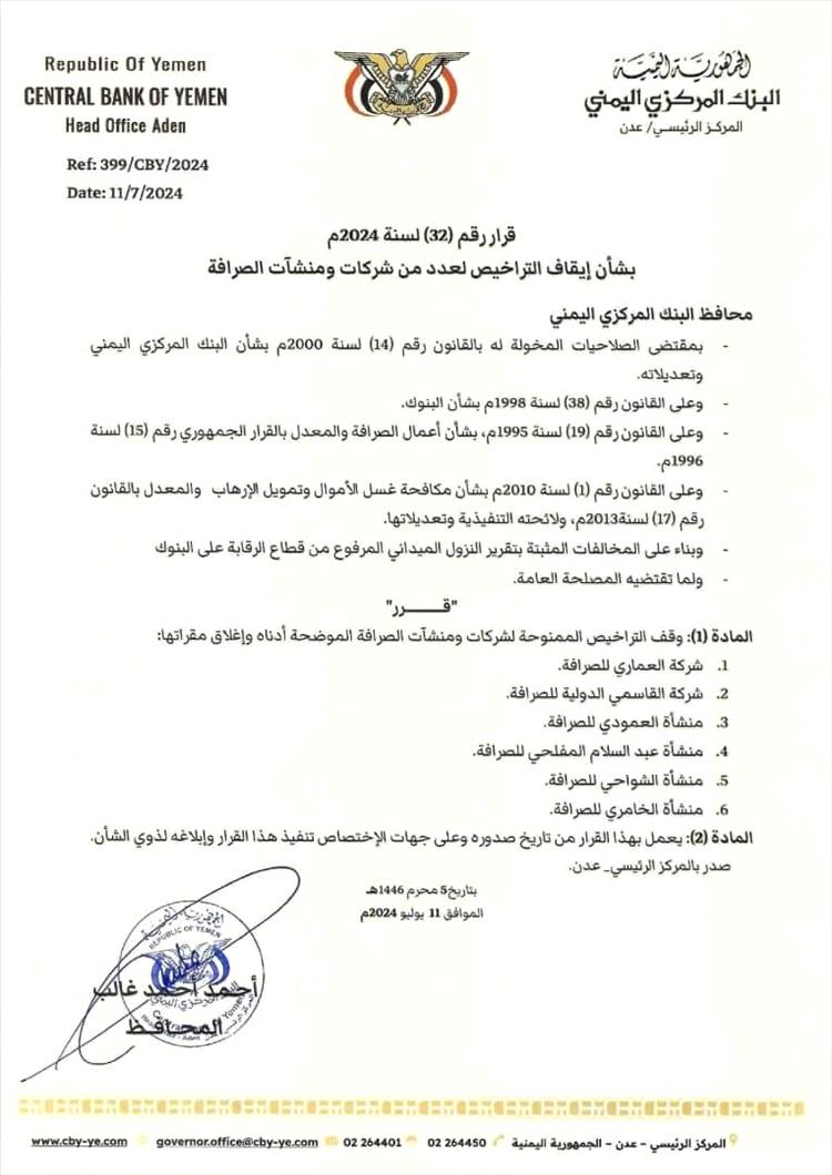 أصدر محافظ البنك المركزي اليمني أ. أحمد أحمد غالب قرار رقم (32) بشأن إيقاف تراخيص عدد من شركات ومنشآت الصرافة التالية: