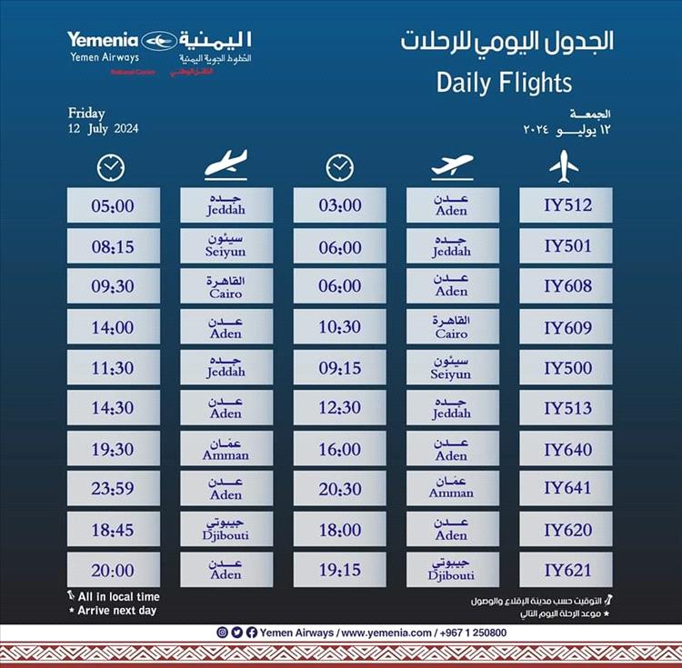 مواعيد إقلاع رحلات طيران اليمنية لليوم الجمعة كالتالي: