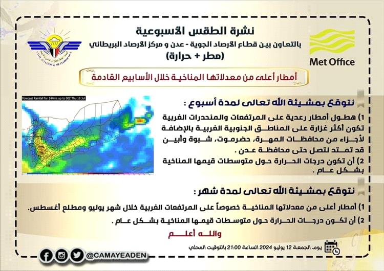 وقال مكتب مديرية البريقة : "بحسب بلاغ عمليات المحافظة، بناءً على تحذيرات الأرصاد الجوية، التي تؤكد احتمالية هطول أمطار رعدية خلال الساعات القادمة ولمدة أسبوع".
