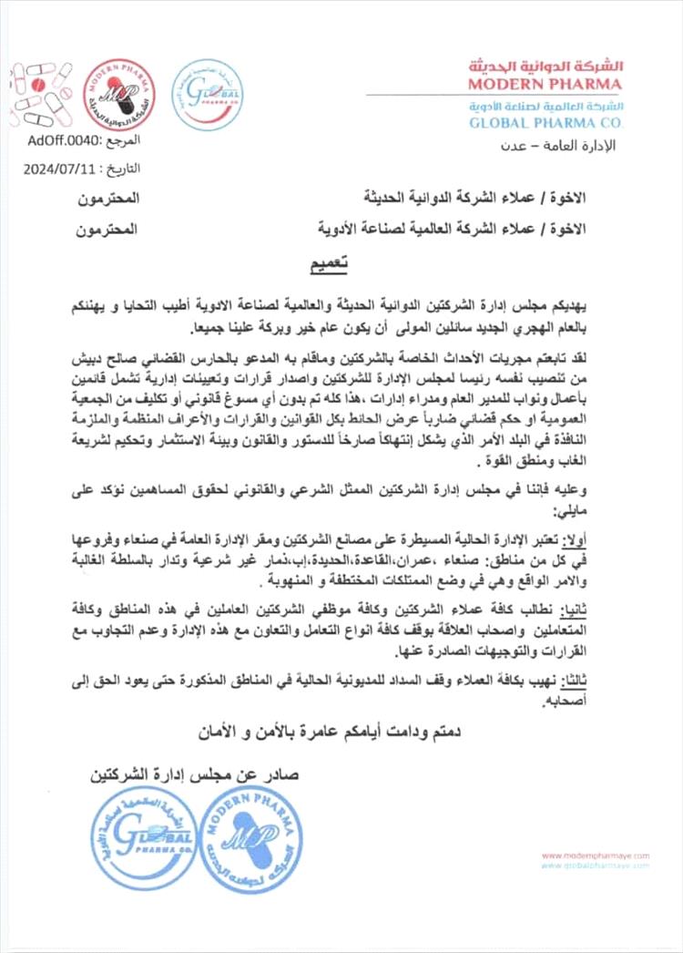 شركتا الدوائية والعالمية تصدران بياناً هاماً: مقرات الإدارة العامة بصنعاء وفروعها "غير شرعية"