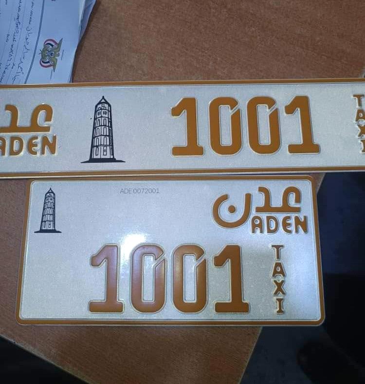 وتتميز هذه اللوحات الجديدة بلونها الأصفر، مع كتابة اسم "عدن" باللغة العربية والإنجليزية داخلها، بالإضافة إلى كلمة "TAXI" على جانب اللوحة.