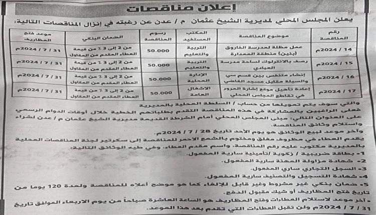 وأشار المجلس المحلي بمديرية الشيخ عثمان، إلى أن آخر موعد لبيع الوثائق والمظاريف - البالغ رسوم كل مناقصة "50" ألف ريال، وقيمة الضمان البنكي ما بين "2 إلى 3%" من قيمة العطاء المقدم من المقاول - هو يوم الأحد الموافق 28 / 7 / 2024م.