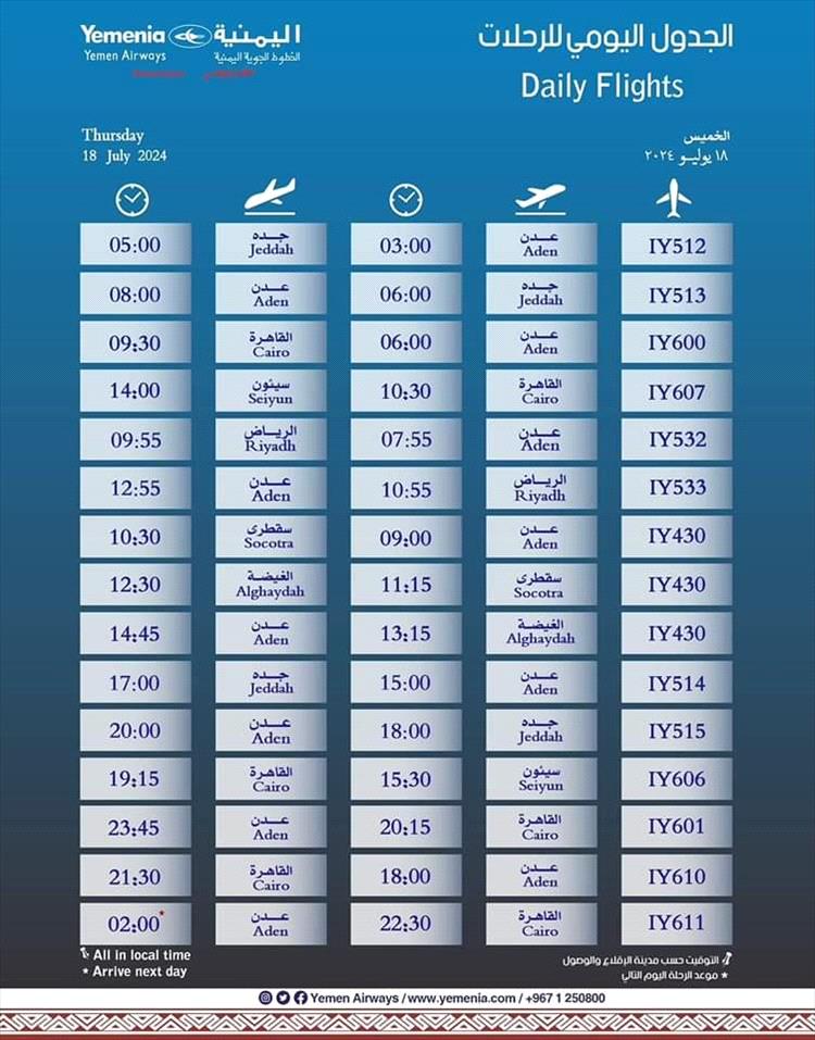 مواعيد اقلاع رحلات طيران اليمنية ليوم غد الخميس