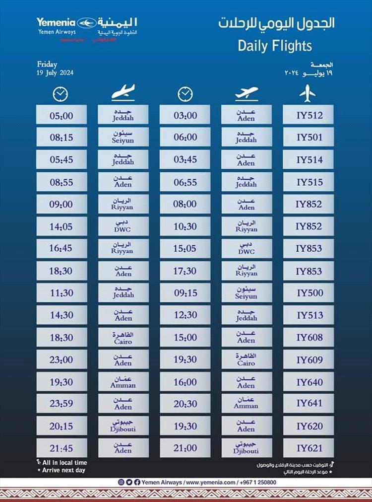 مواعيد اقلاع رحلات طيران اليمنية ليوم غد الجمعة كالتالي: