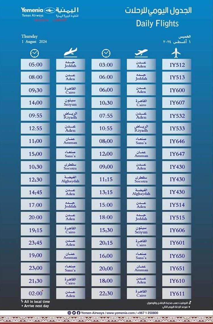 مواعيد اقلاع رحلات طيران اليمنية ليوم غد الخميس كالتالي: