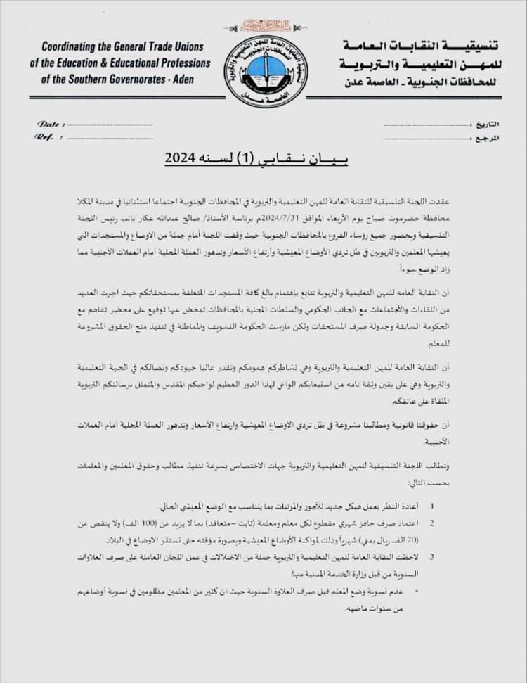 اصدرت اللجنة التنسيقية لنقابة المهن التعليمية والتربوية بمحافظة عدن وحضرموت وشبوة ولحج وابين والمهرة عفب اجتماعها الأستثنائي المنعقد في مدينة المكلا بيانا موحدا حددت في جملة من المطالب والإجراءات التي يجب على حكومة المناصفة القيام بها بشأن تصحيح وتسوية وضع المعلمين وتحسين ظروفهم المعيشية لضمان استتباب العملية الدراسية وحصل موقع عدن تايم على نسخة من البيان الرسمي