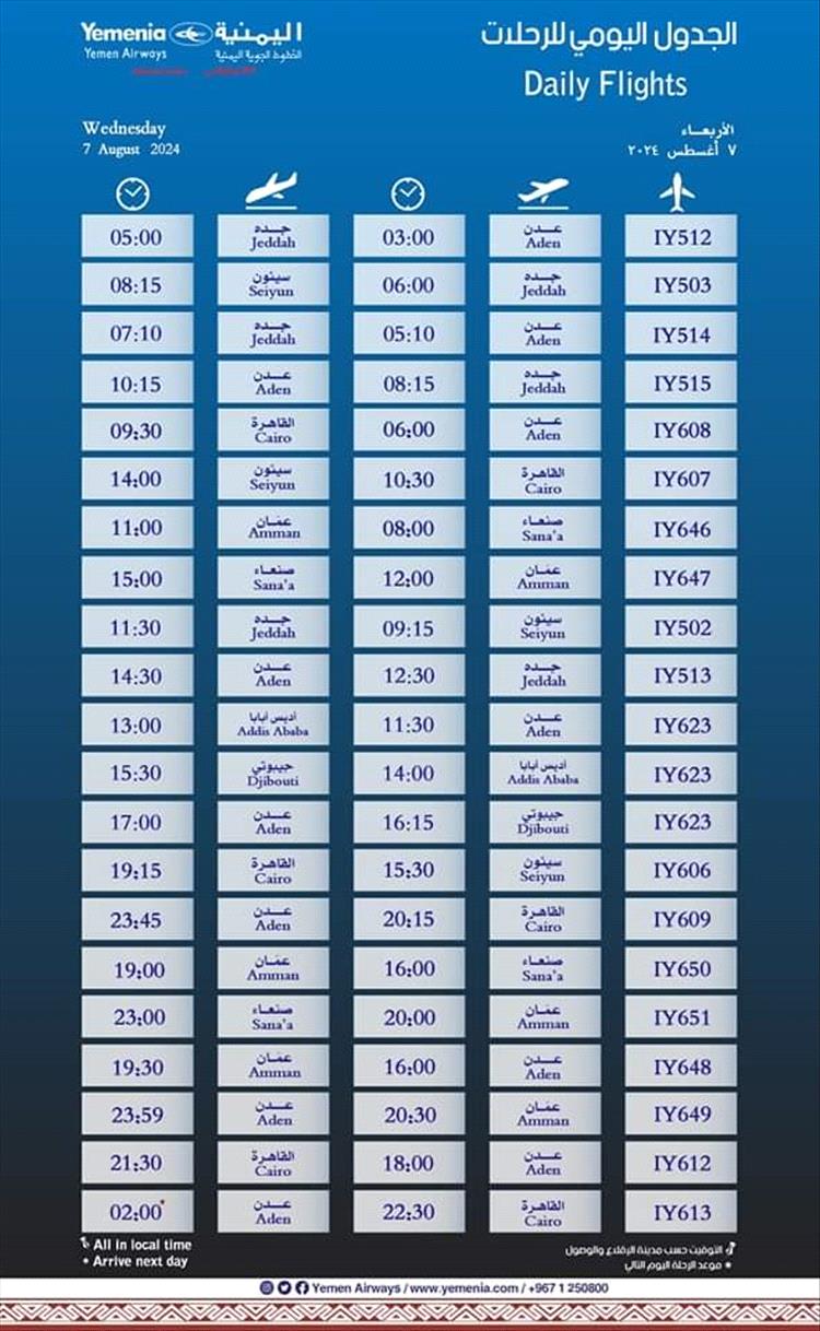 جدول مواعيد اقلاع رحلات طيران اليمنيه ليوم غد الاربعاء