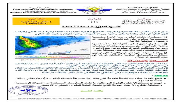 2) استمرار هطول أمطار متفاوتة الشدة بعضها رعدية على أجزاء من صحاري ومرتفعات وهضاب وسواحل محافظات (المهرة، حضرموت، شبوة، أبين، البيضاء، الضالع ولحج)، وقد تمتد حتى محافظة عدن.