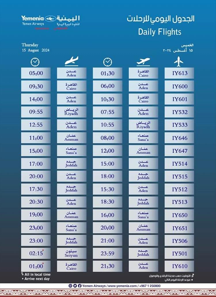 مواعيد اقلاع رحلات طيران اليمنية ليوم غد الخميس كالتالي: