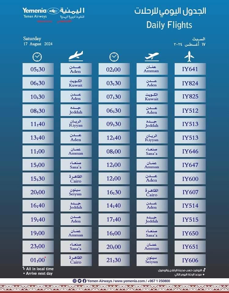 مواعيد اقلاع رحلات طيران اليمنية لليوم السبت كالتالي: