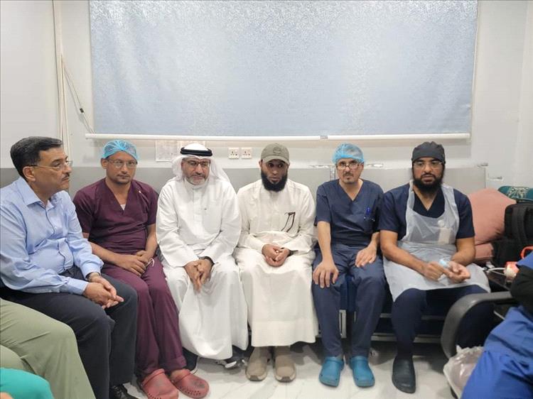 الوفد والفريق الطبي الكويتي من جمعية ايلاف الخيرية الكويتية مع طاقم المستشفى الأمريكي الحديث بحضور سفير بلادنا لدى الكويت الدكتور علي منصور بن سفاع في استراحة عمليات المستشفى.