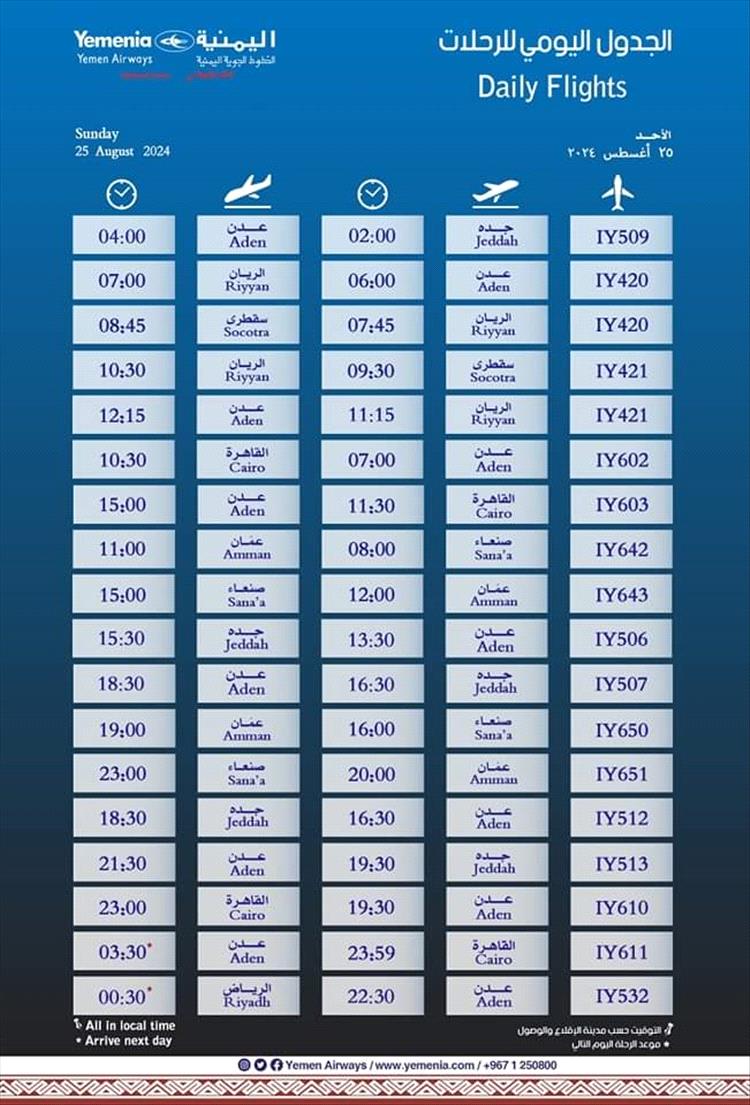 مواعيد اقلاع رحلات طيران اليمنية لليوم الاحد كالتالي: