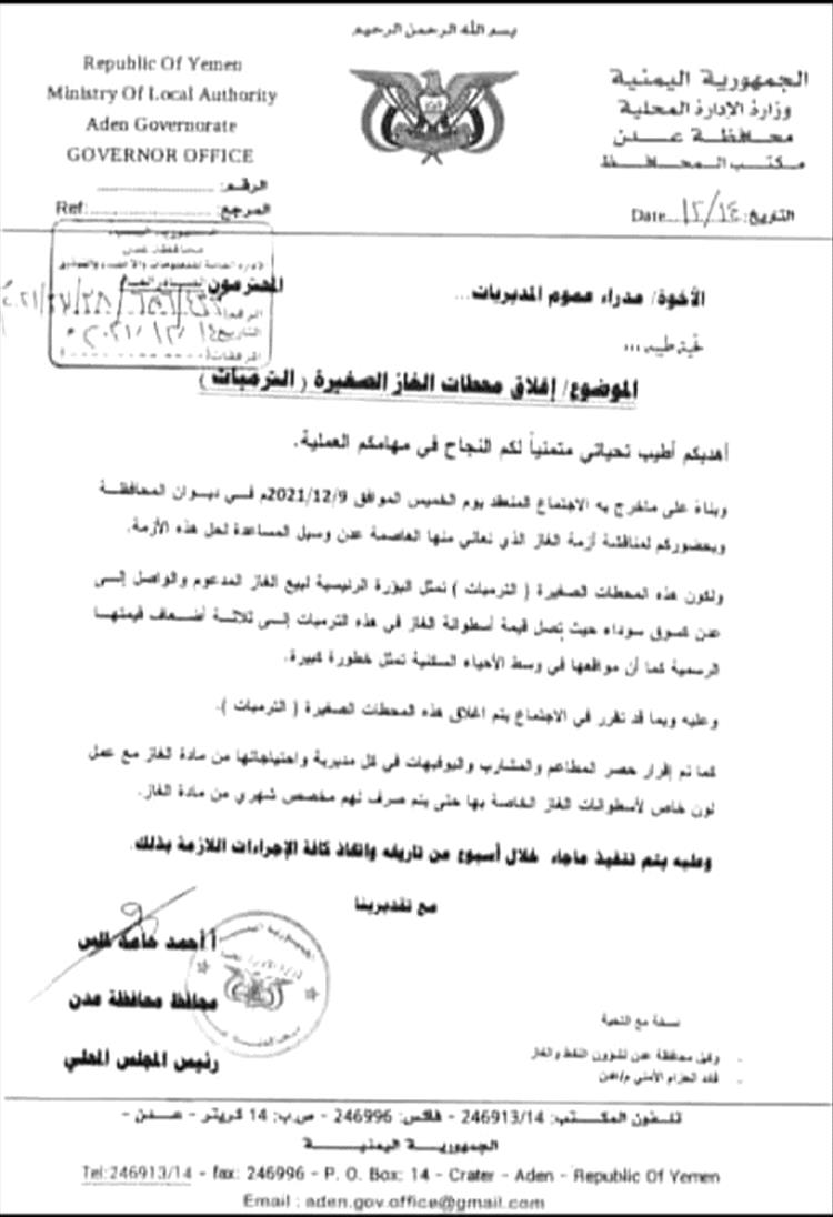 الوثيقة، التي تحمل تاريخ 15 ديسمبر 2021، تؤكد توجيهات المحافظ بإغلاق محطات الغاز الصغيرة بسبب مخاطرها الكبيرة على سلامة السكان في المناطق السكنية، وقد حث المحافظ على تنفيذ هذه القرارات خلال أسبوع من تاريخ التوجيه واتخاذ كافة الإجراءات اللازمة لضمان سلامة المواطنين.