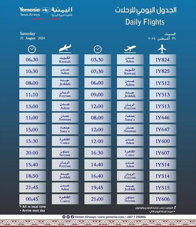 مواعيد اقلاع رحلات طيران اليمنية لليوم السبت كالتالي: