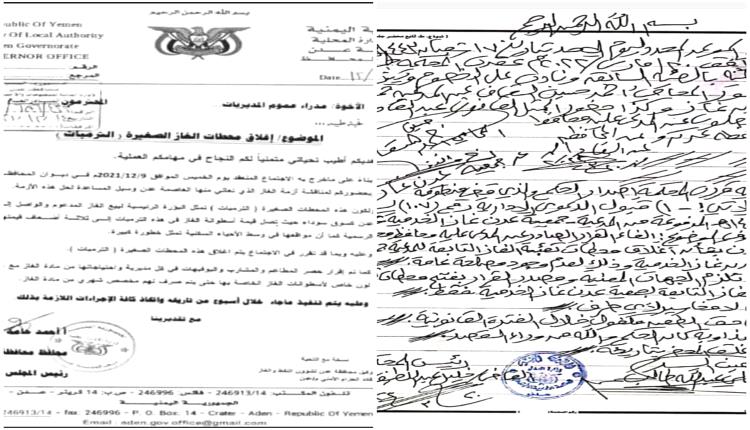 ففي الوثيقة الاولى عبارة عن خطاب موجه من المحافظ احمد حامد لملس الى مدراء عموم المديريات يقضي باغلاق ترمبات محطات الغاز الصغيرة وفقا لمخرجات الاجتماع في ٩ ديسمبر ٢٠٢١م.