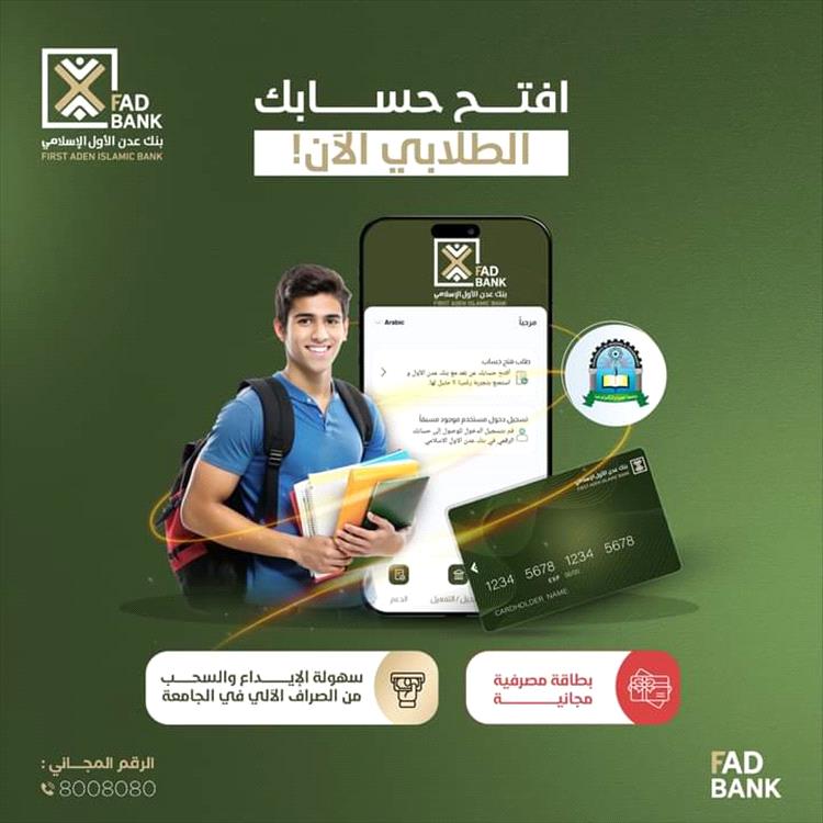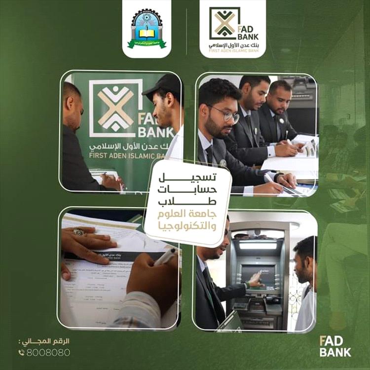 أعلن بنك عدن الأول الإسلامي- FAD Bank عن استمرار حملته لفتح الحسابات المصرفية الطلابية لطلاب جامعة العلوم والتكنولوجيا، وذلك ضمن سعيه لتقديم خدمات مصرفية مميزة تلبي احتياجات الطلاب.