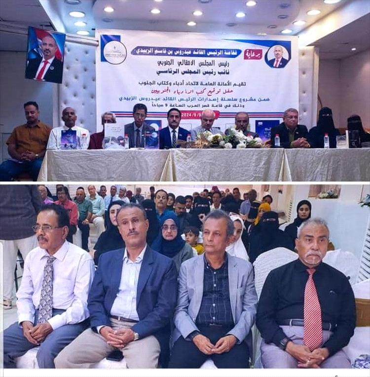 برعاية فخامة الرئيس القائد عيدروس بن قاسم الزبيدي نظمت الأمانة العامة لاتحاد أدباء وكتاب الجنوب صباح اليوم الأثنين ٩ سبتمبر ٢٠٢٤ حفل توقيع المجموعة الرابعة من سلسلة إصدارات الرئيس عيدروس بن قاسم الزبيدي.