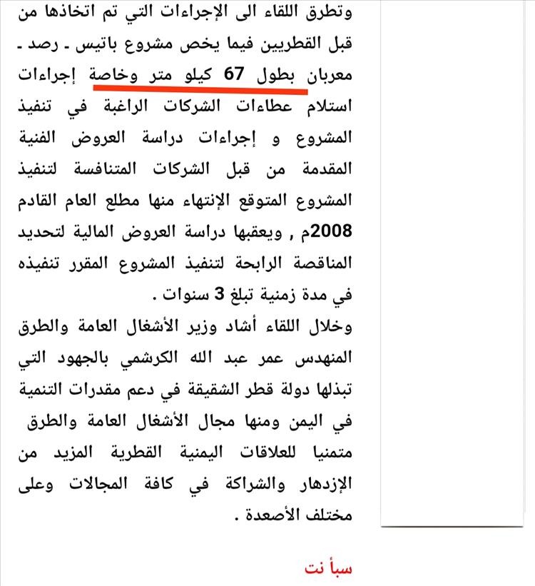 واورد خبر اللقاء الذي نشر في موقع رئاسة الوزراء ووكالة سبأ الرسمية، مناقشة عدد من مسارات الدعم ومن ضمنها، مناقشة طريق باتيس رصد، حيث ورد بالنص : "استكمال طريق باتيس رصد الاستراتيجي في يافع والبالغ طوله 110 كيلو متر وتم انجاز 70 بالمائة منه بدعم قطري".