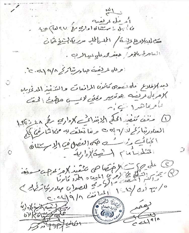 وأوضحت وثيقة الشعبة المدنية والإدارية بمحكمة استئناف عدن أن الاستئناف الإداري رقم 27 للعام 1445هجرية، قد تلقى طلب الأمر على عريضة مقدم من المجلس المحلي بمديرية الشيخ عثمان صادر ضد جعفر علي عبد الرب.