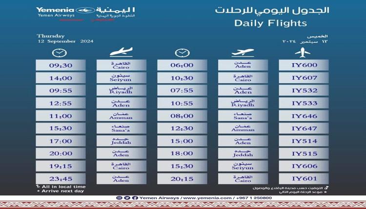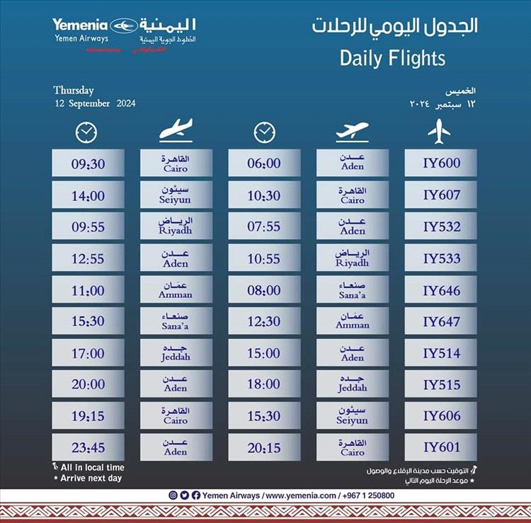 مواعيد اقلاع رحلات طيران اليمنية ليوم غد الخميس كالتالي: