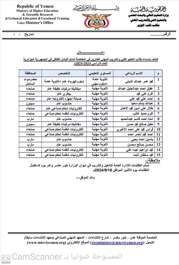 وثيقة - وزارة التعليم العالي تعتمد 15 منحة خارجية لطلاب الثانوية المهنية معظمهم من مناطق الحوثي