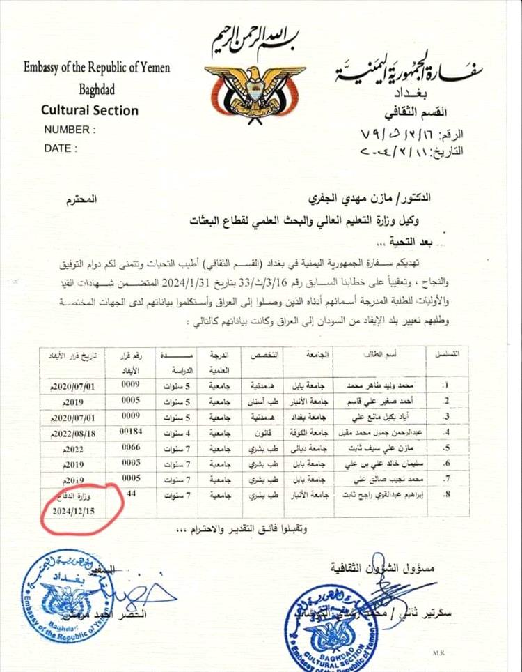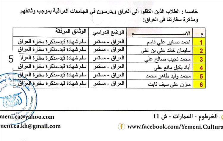 وحسب وثيقة رسمية فقد وجهت السفارة اليمنية في العراق خطاب إلى وكيل وزارة التعليم العالي لقطاع البعثات تؤكد أن الطلاب وصلوا إلى العراق واستكملوا بيناتهم، وطلبهم تغيير بلد الايفاد من السودان إلى العراق، ومع ذلك لم يتم الاستجابة لهذا الرسالة التى مضى عليها حوالي 6 أشهر.