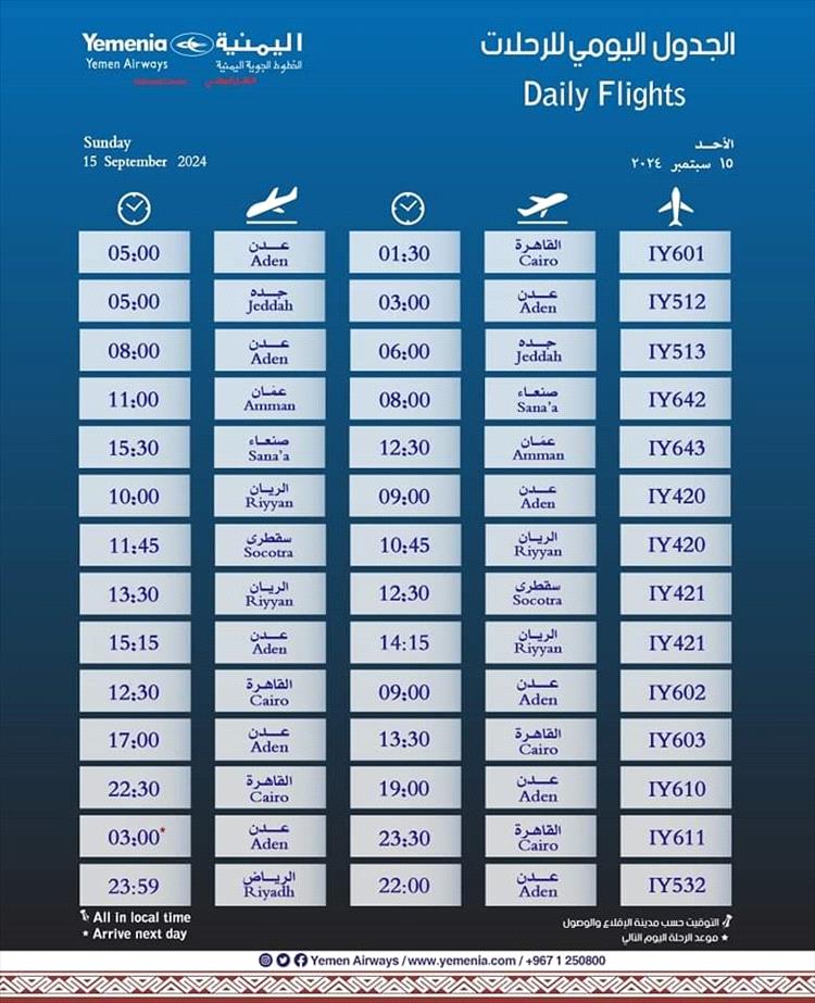 اقلاع رحلات طيران اليمنية لليوم الاحد كالتالي: