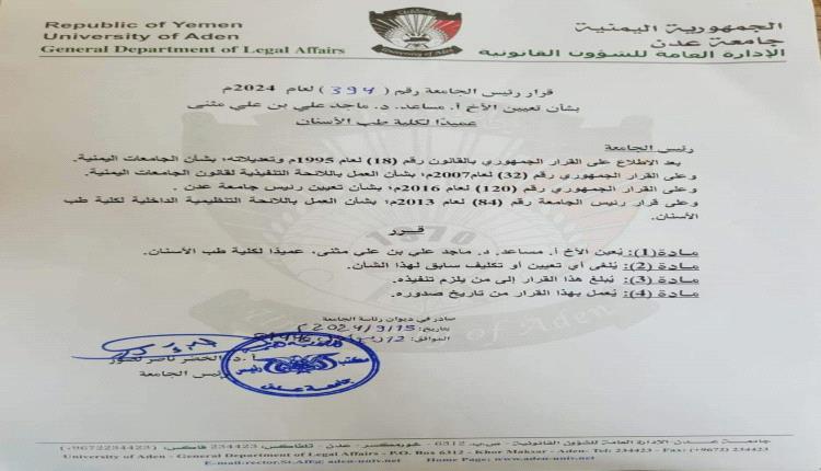 تعيين عميد لكلية طب الأسنان جامعة عدن