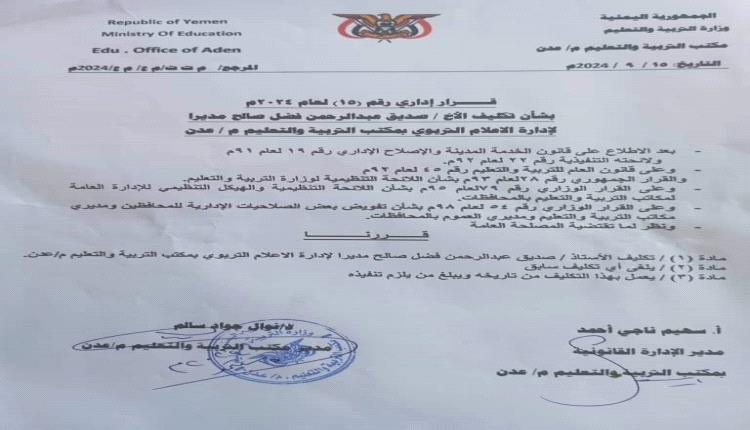 تعيين مدير لإدارة الإعلام التربوي بمكتب التربية والتعليم عدن