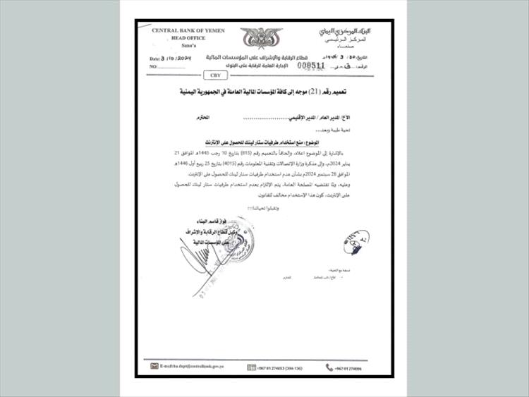 وأصدرت المليشيات تعميماً للبنوك والمؤسسات المالية عبر البنك المركزي بصنعاء، يحظر استخدام خدمات "ستارلينك" في أي من الأنشطة المصرفية.