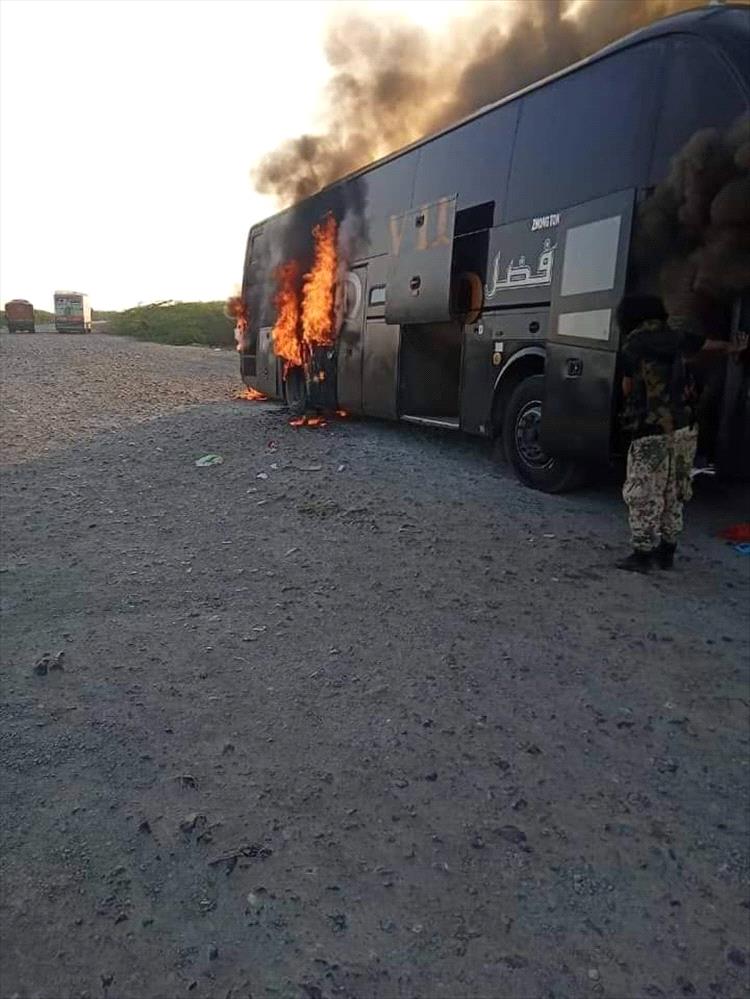 اندلع حريق في حافلة نقل جماعي بمنطقة حسان بمحافظة أبين، كانت تقل خمسين راكبًا قادمين من السعودية.