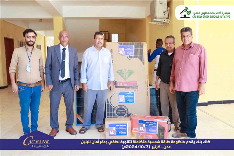 سلم بنك التسليف التعاوني والزراعي �كاك بنك� صباح يوم الإثنين أنظمة للطاقة الشمسية لثلاث مدارس في مديرية صيرة بعدن، مساهمة منه في دعم القطاع التعليمي وتخفيف معاناة الطلاب والمعلمين في مواجهة درجات الحرارة المرتفعة والانقطاعات المتكررة والمستمرة للتيار الكهربائي بعدن.