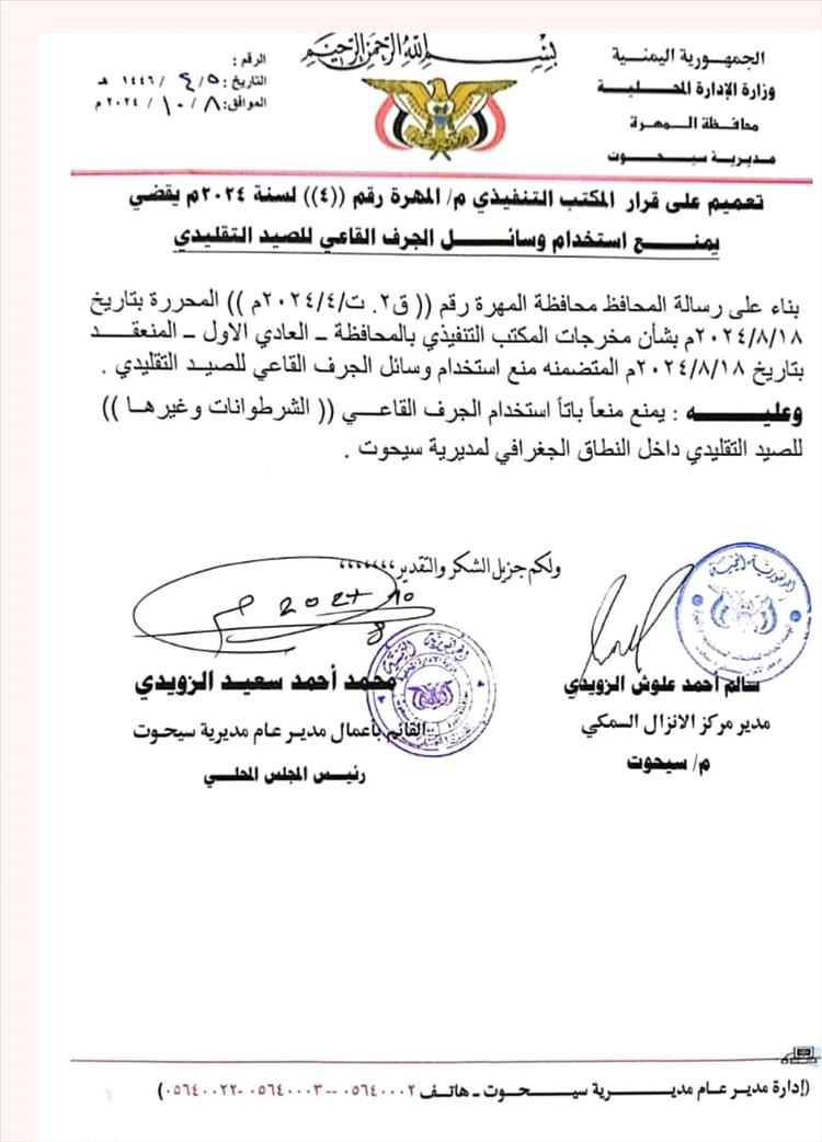 وجاء التعميم بناءً على قرار محافظ محافظة المهرة بشأن مخرجات الاجتماع العادي الأول للمكتب التنفيذي بالمحافظة المنعقد بتاريخ 18/أغسطس/2024م، والتضمنة منع استخدام وسائل الجرف القاعي للصيد التقليدي.