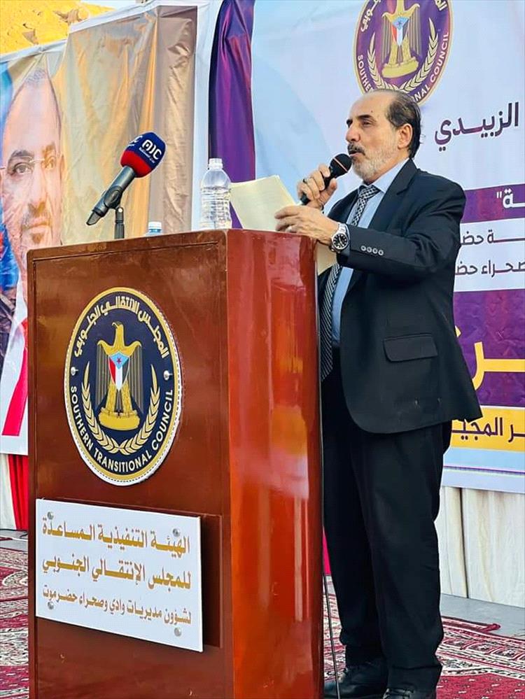 ثم ألقى الأستاذ محمد عبدالملك الزبيدي، رئيس الهيئة التنفيذية المساعدة للمجلس الانتقالي الجنوبي بوادي حضرموت، كلمة شدد فيها على أهمية قرار حضرموت المستقل قائلاً: "نحن هنا لنقول للجميع، داخل وخارج حضرموت، بأننا لن نسمح لأي جهة بادعاء الوصاية علينا، وأن القرار هو قرار الشعب، وصوت حضرموت هو صوتكم أنتم، الأوفياء الحاضرون هنا".