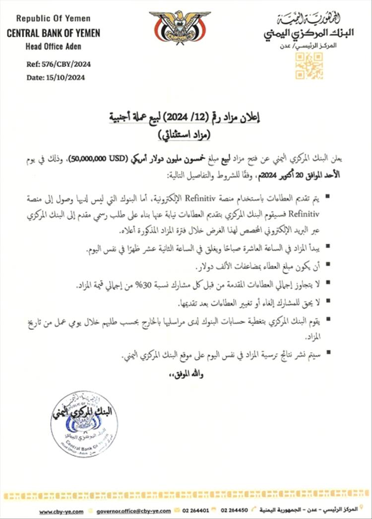 أعلن البنك المركزي بعدن عن فتح مزاد لبيع مبلغ خمسون مليون دولار أمريكي (50,000,000 USD)، وذلك في يوم الأحد الموافق 20 أكتوبر 2024م، وفقًا للشروط والتفاصيل التالية: