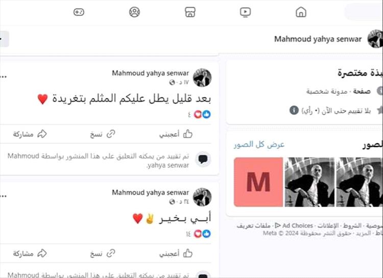 أبي حـــي، بعد قليل يطل عليكم الملثم بتغريدة، السنوار حي يرزق .. تدوينات تداولها مستخدمون عبر موقع التواصل الاجتماعي فيس بوك، على مدار الساعات القليلة الماضية من مساء الخميس، منسوبة لحسابات باسم Mahmoud yahya senwar، يزعم مُنشئها أنه ابن يحيى السنوار، زعيم حركة حماس، الذي أعلنت إسرائيل اغتياله في قطاع غزة، ويشير إلى أن والده مازال على قيد الحياة، وأنه لم يغتال كما أعلن الجانب الإسرائيلي.
