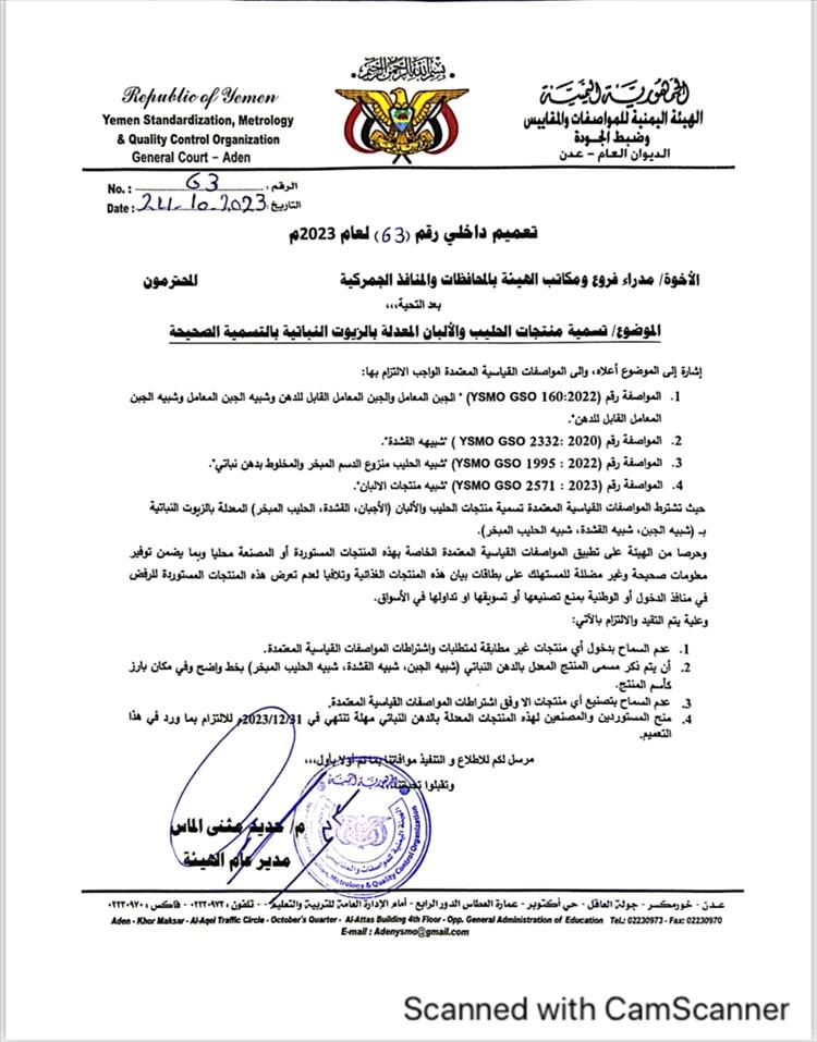 قال المهندس حديد الماس رئيس الهيئة اليمنية للمواصفات والمقاييس وضبط الجودة في تصريح خاص أن ما يتم تداوله في وسائل التواصل الاجتماعي حول أن منتجات الحليب المبخر (حليب الشاي)، المدون عليها "شبيه الحليب المبخر" غير صحية ومغشوشة غير صحيح ولا يمت للحقيقة بصلة وهو كلام هدفه التضليل على المستهلكين.