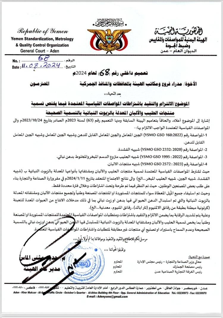 وأضاف بالقول أن الهيئة هي من الزم المصنعين الوطنيين والمستوردين بالالتزام باشتراطات المواصفات حيث أصدرت الهيئة تعميمين الأول برقم (64)، لعام 2022م، صادر بتاريخ 2022م/8/ 21 وأعطت المصنعين والمستوردين مهلة لتسوية أوضاعهم حيال تغيير مسميات المنتجات التي أُستبدل الدهن الحيواني فيها بدهن نباتي، والتعميم الثاني برقم (68) لعام 2024م صادر بتاريخ 11/8/2024.