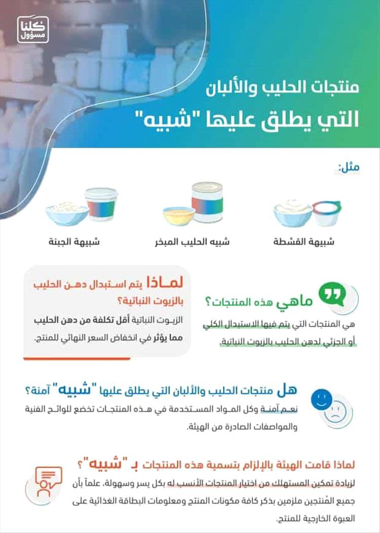 وهنا لزم التوضيح بأن المواصفات القياسية المعتمدة تسمح بنزع الدهن الحيواني واستبداله بدهن نباتي في منتجات الحليب المبخر (حليب الشاي)، والجبن القشطة شريطة أنه اذا تم نزع الدهن الحيواني واستبداله بدهن نباتي في هذه المنتجات ان يتم تغيير اسم المنتج الى "شبيه الحليب المبخر ، وشبيه الجبن، وشبيه القشطة".