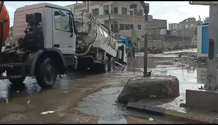 على إثر تدفق مياه سيول الامطار انهارت غرفة التفتيش الواقعة في تقاطع ملعب الحبيشي بكريتر مديرية صيرة مما الى سقوط سيارة شفط مياه الامطار.
