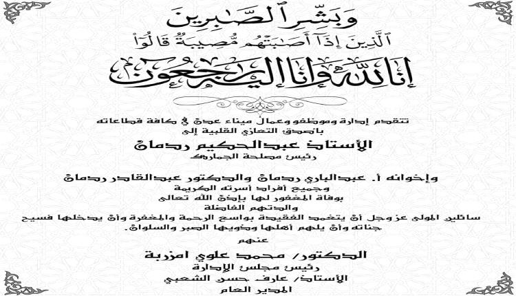 وإخوانه أ. عبد الباري ردمان والدكتور عبد القادر ردمان وجميع أفراد أسرته الكريمة بوفاة المغفور لها بإذن الله تعالى والدتهم الفاضلة سائلين المولى عز وجل أن يتغمد الفقيدة بواسع الرحمة والمغفرة وأن يدخلها فسيح جناته وأن يلهم أهلها وذويها الصبر والسلوان.