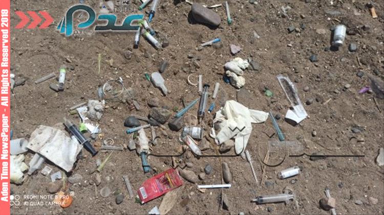 وقال عدد من المواطنين إن هذه المواد تستخدم بالمختبرات لاجراء الفحوصات الطبية تم رميها وسط الطريق جوار سوق القات بمنطقة الفيوش بالقرب من القمامة المنتشرة في هذا المكان.