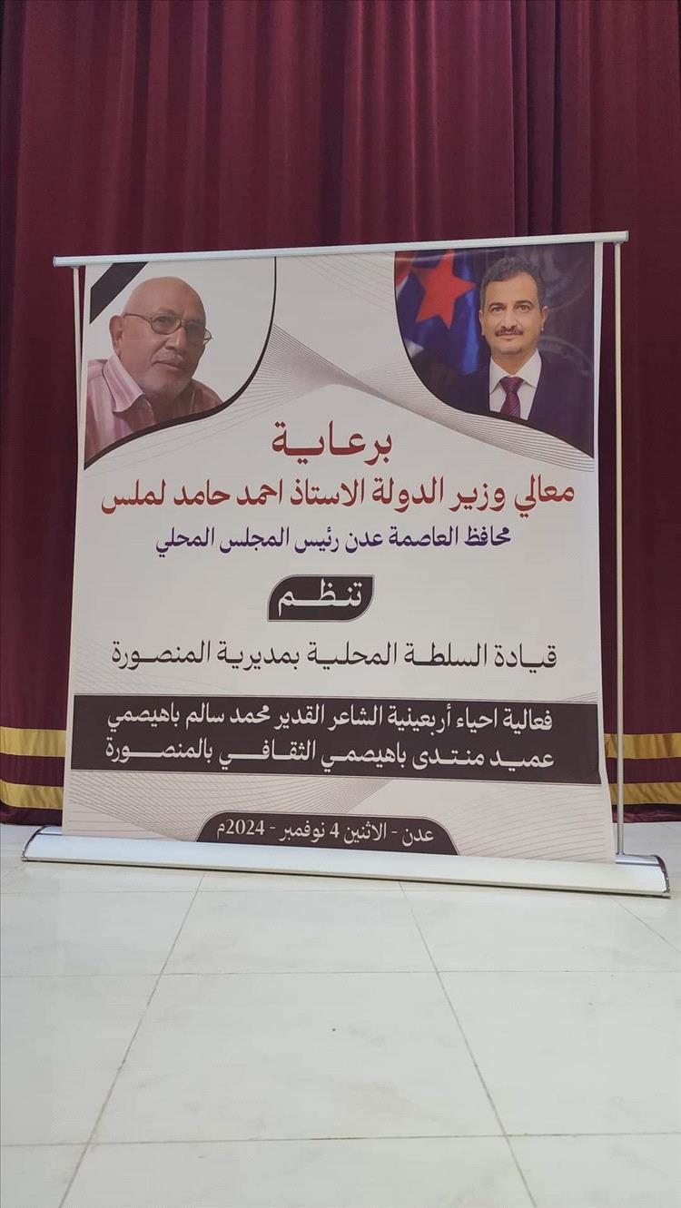 برعاية معالي وزير الدولة الاستاذ احمد حامد لملس محافظ العاصمة عدن رئيس المجلس المحلي نظمت السلطة المحلية بمديرية المنصورة صباح يوم امس في قاعة المجلس المحلي للمؤتمرات فعالية احياء اربعينية الفقيد الشاعر محمد سالم باهيصمي .